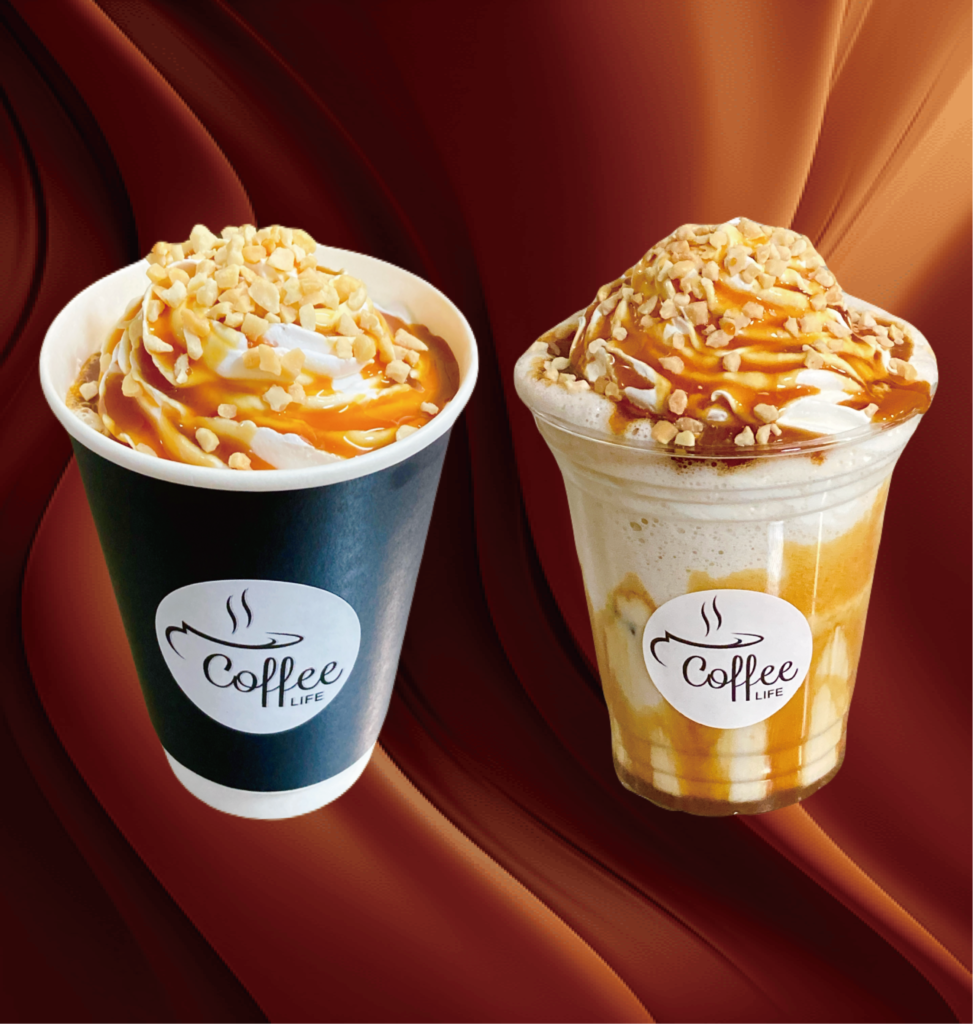 ほうじ茶ミルクにホイップとキャラメル、ナッツをトッピングしました。