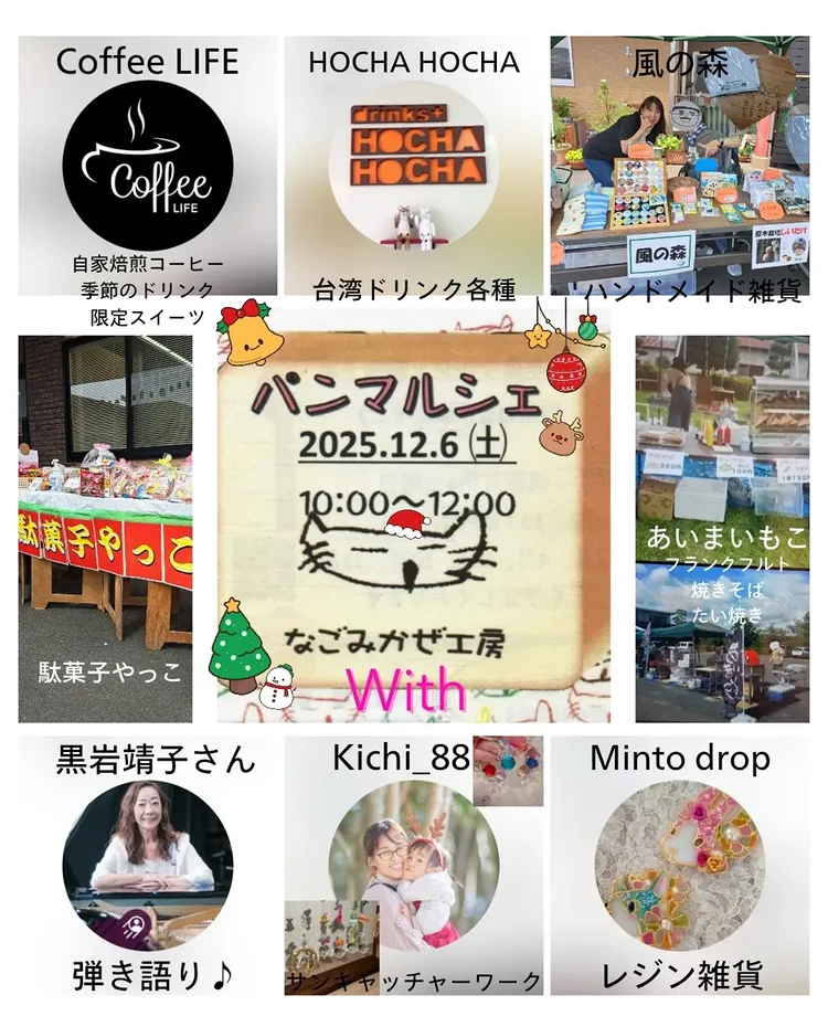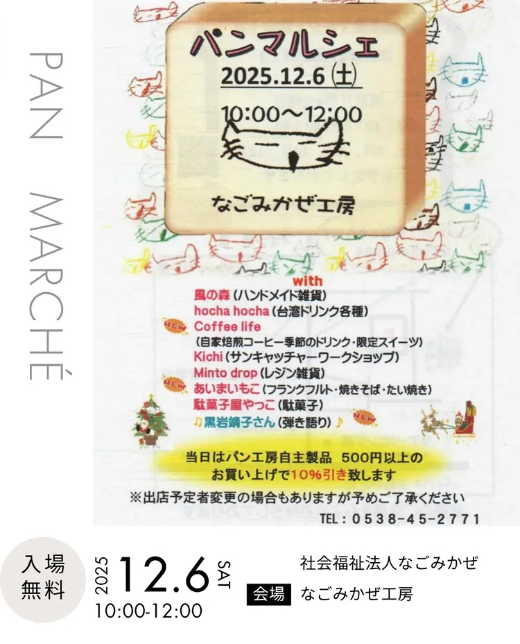 ①パンマルシェ/なごみかぜ工房 開催日: 2025年12月6日カテゴリー: 出店一覧 出店日:2025年12月6日(土) 営業時間:10時00分〜12時00分 出店場所:なごみかぜ工房/袋井市小山984 お客様のご来店心よりお待ちしております。 ご予約について コーヒー豆のご予約や配達(ご予約の詳細) コーヒーゼリーのご予約も承っております。 ご連絡はInstagramのDMまたはLINEにて。 Instagram LINE
